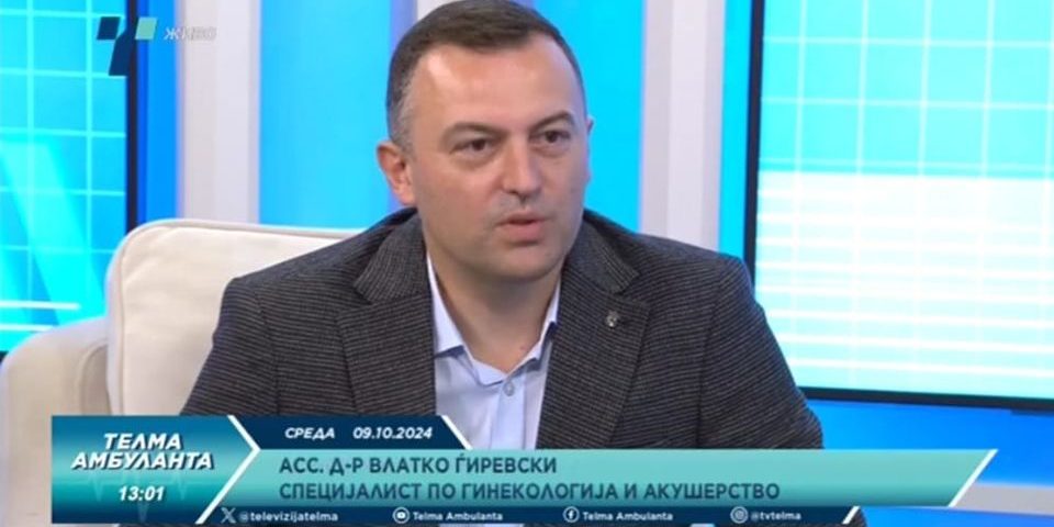 По повод 18 октомври, Светскиот ден на менопаузата, во Телма амбуланта на 09.10.2024 гостуваше асс .д-р Влатко Ѓиревски. Tags: ѓиревскименопаузасовети Споделете: Share on FacebookShare on Facebook TweetShare on Twitter Pin itShare on Pinterest Share on LinkedInShare on LinkedIn Post navigationPreviousPrevious post:(ВИДЕО) „Третман и терапија во менопауза“ – асс. д-р Марија ЈоксимовиќNextNext post:(ВИДЕО) Сè што жените треба да знаат за менопаузата – асс. д-р Софија Златеска ЃуриќПоврзани вести(ВИДЕО) Проф. д-р Алексиоска Папестиев: Ја возобновуваме школата за психофизичка подготовка на труднициSeptember 18, 2025Школа за психофизичка подготовка на идните мајки почнува на ГАК од 1 октомвриSeptember 18, 2025Промоција на „Фактори на ризик за настанување, дијагноза и третман на CIN“ од проф. д-р Горан ДимитровJuly 23, 2025Медицински тим на ГАК на напредна лапароскопска обука во болницата „Св. Лука“ во СолунJuly 21, 2025ФЗО ЌЕ ОВОЗМОЖИ ШЕСТ ИН-ВИТРО ОПЛОДУВАЊАJuly 21, 2025(ВИДЕО) На ГАК се враќа интервенцијата за уринарна инконтиненцијаJuly 2, 2025
